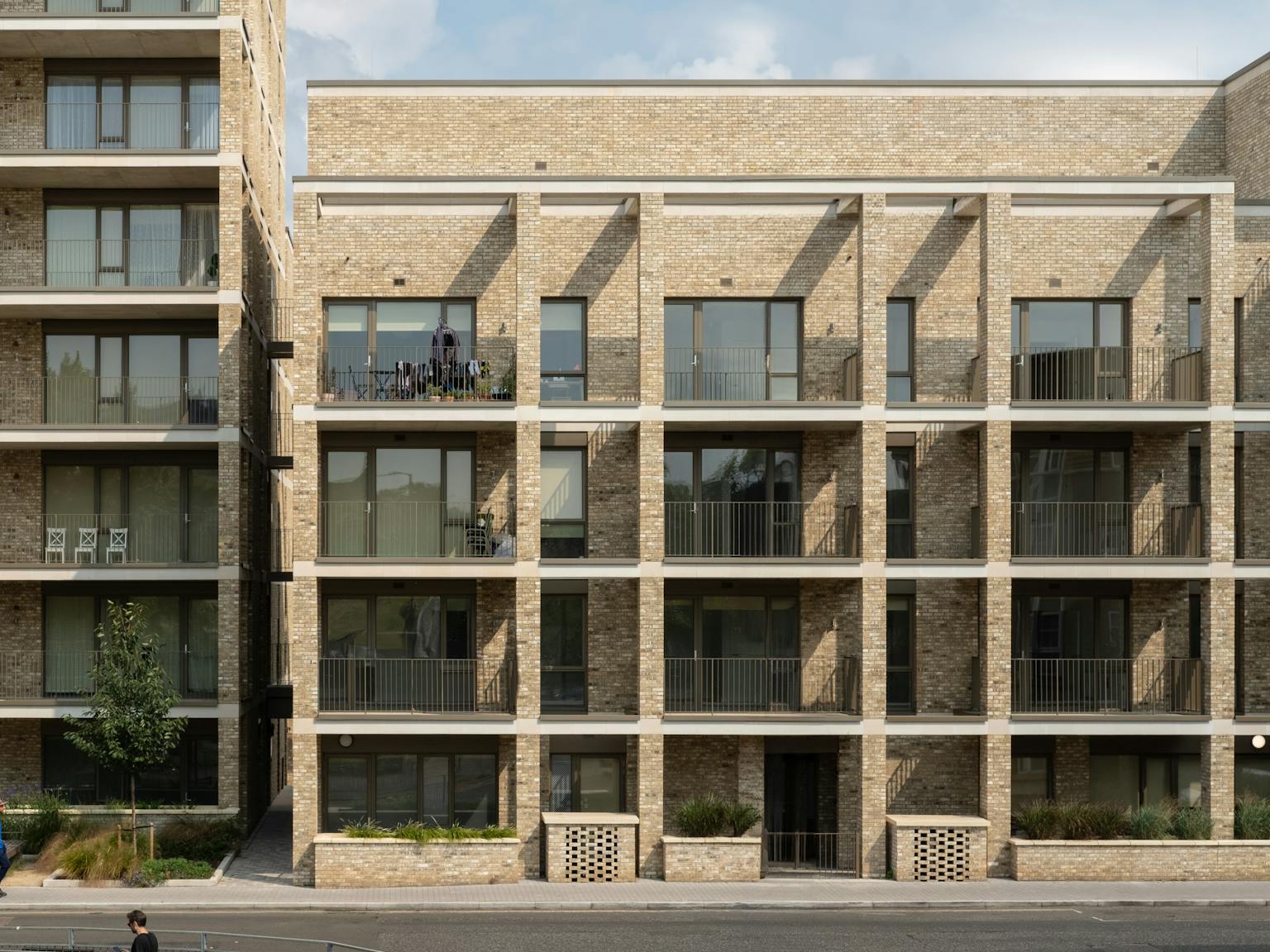 The main façade overlooking the park has brick piers and horizontal precast concrete elements, enclosing a series of generously-proportioned decks and balconies for the upper-floor flats and external space for ground-level units – deemed by the jury ‘a nice play between boundaries’. This ‘architectural screen’ also acts as a buffer to traffic noise. Elsewhere, a palette of pale brick, powder-coated steel railings and granite pavers unites the development with the existing estate. ‘There’s a feeling of lightness,’ said the judges, who also praised the ‘good material choices’ and attention to detail.