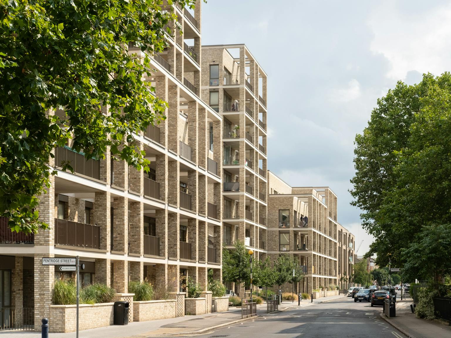 The tenure-blind residential development in Peckham for Southwark Council provides 109 homes for social rent and shared ownership. Responding to local needs, the unit mix is a flexible range of one to four-bed homes. Previous regeneration on the North Peckham Estate had left two vacant sites divided by a busy road. Temporary buildings had been cleared from the sites, apart from two brick water towers, which had become local landmarks. The challenge was to deliver new homes into the existing estate while improving the surrounding public realm.