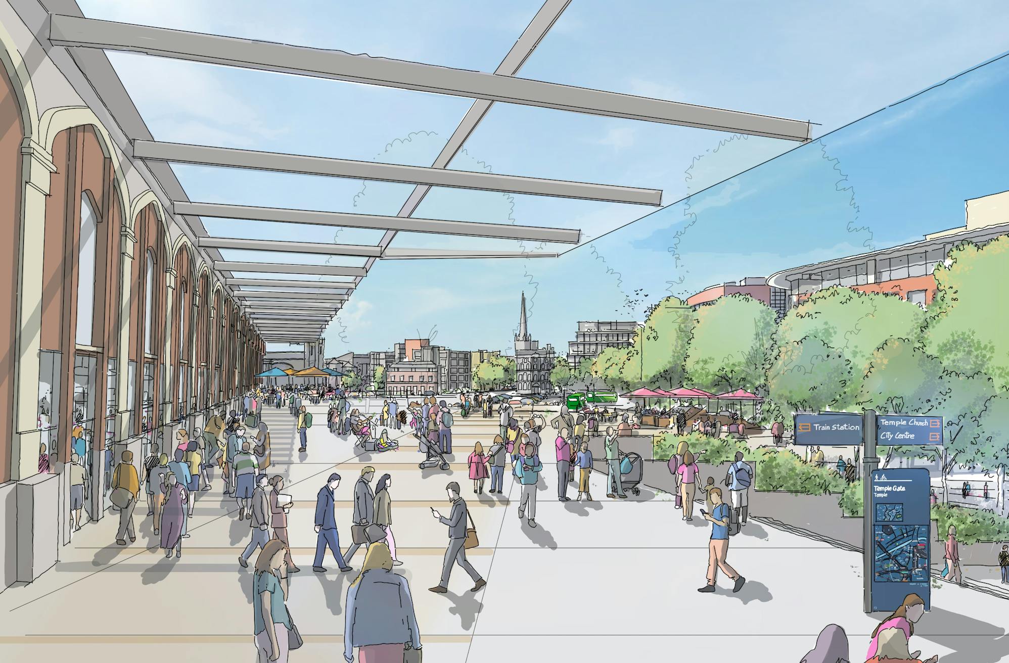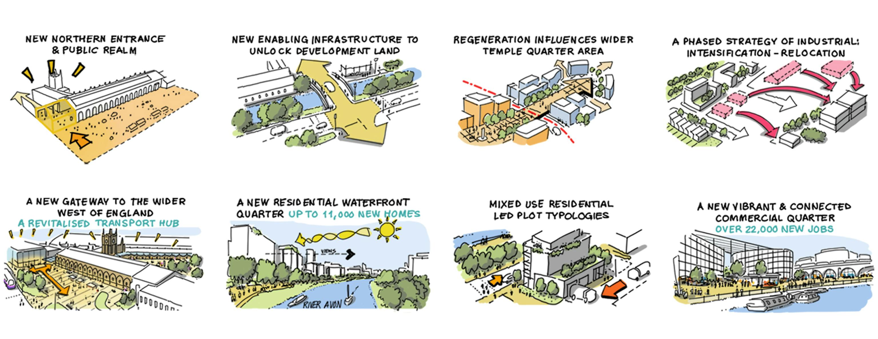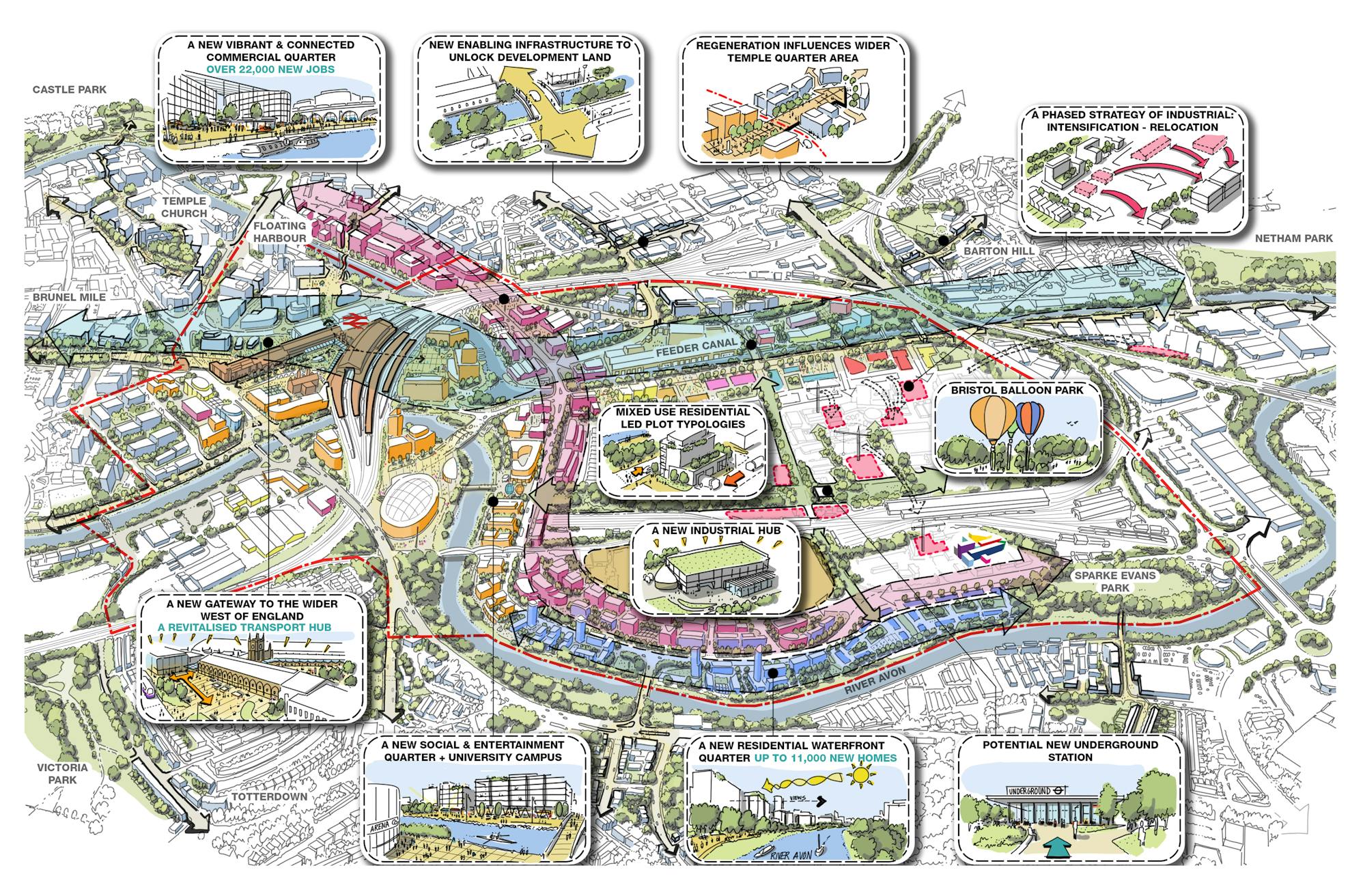 Our masterplan sets out an exciting vision for a 130 hectare development zone, delivering a mixed use city quarter that will provide up to 10,000 new homes alongside a range of employment, commercial and leisure facilities. New public space and transport connections are at the heart of the masterplan, making Bristol Temple Quarter an exceptional place to live and work.