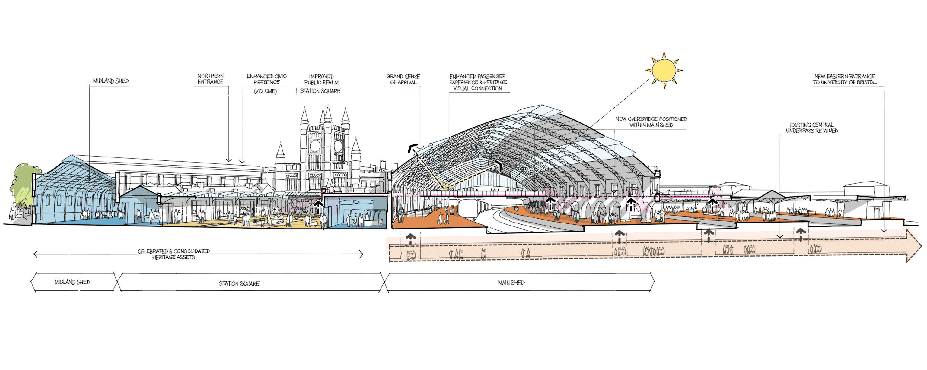 Holistic urban scale thinking balanced with architectural sensitivity allowed us to ensure the station’s relevance to a changing Bristol. The Grade I heritage listed station was preserved and updated with new facilities to address an anticipated doubling of passenger numbers. We collaborated with Historic England and many other stakeholders, including Bristol City Council and Network Rail, to maximise the masterplan’s opportunities for regeneration while respecting this icon of Britain’s railway heritage.