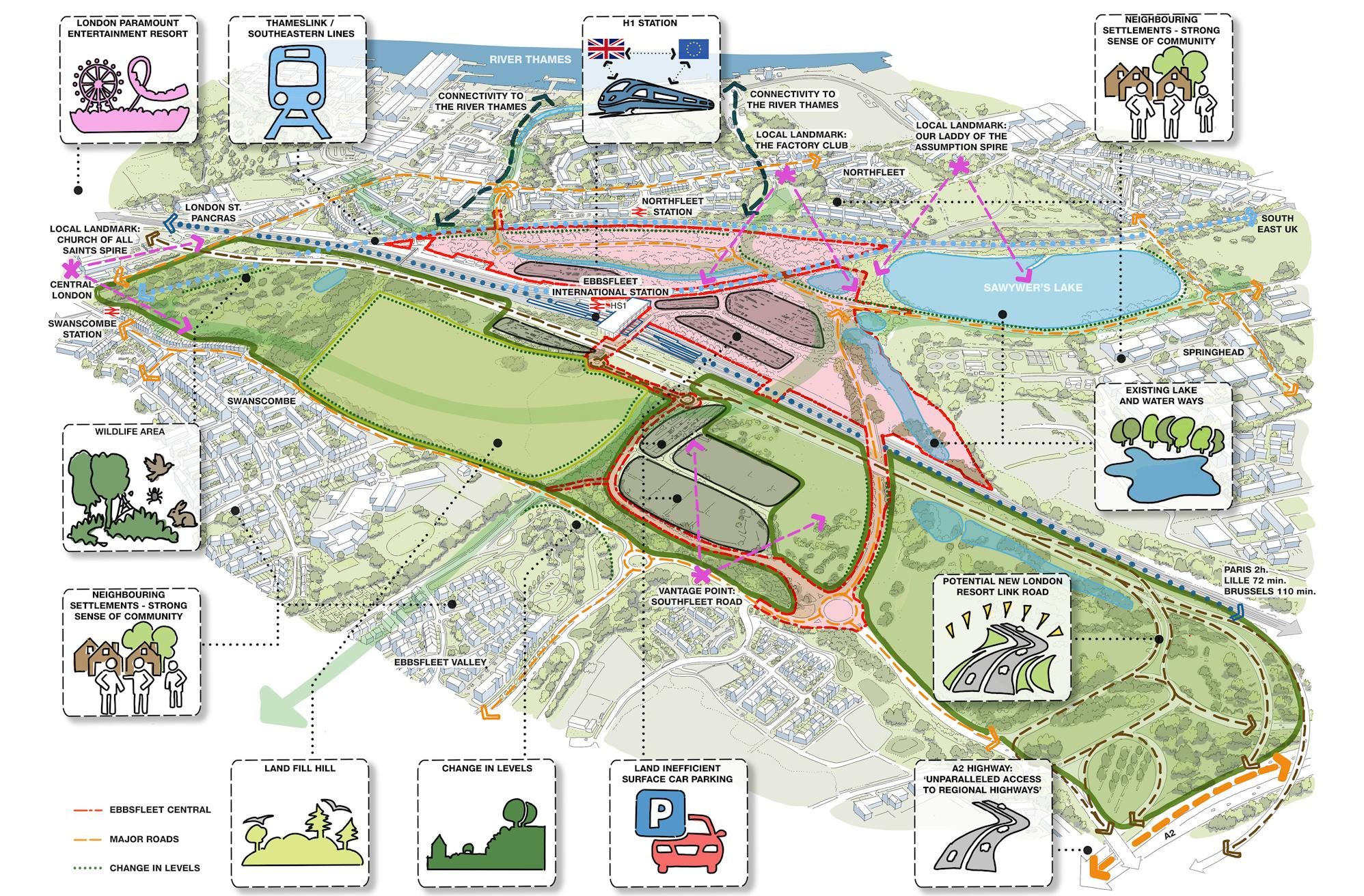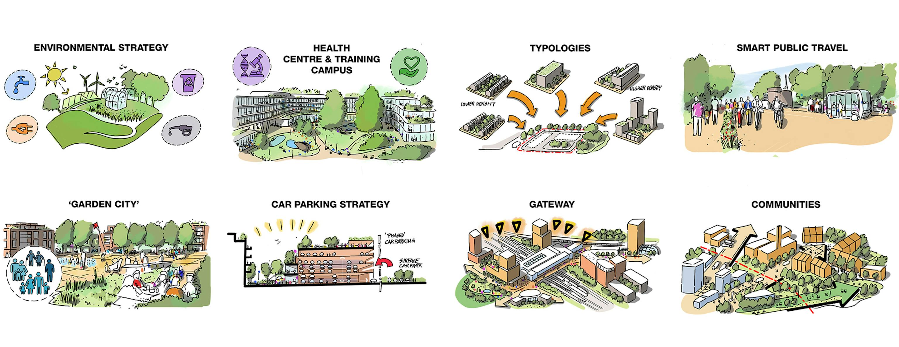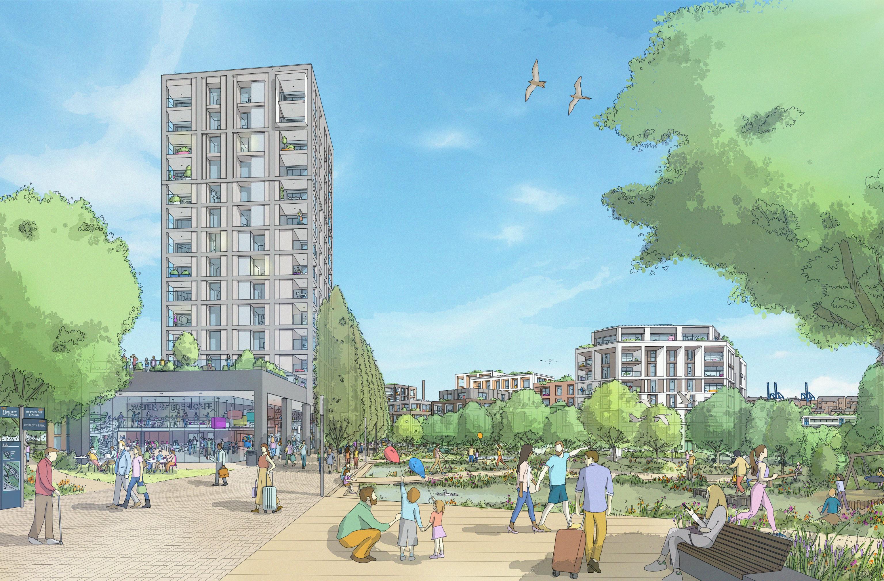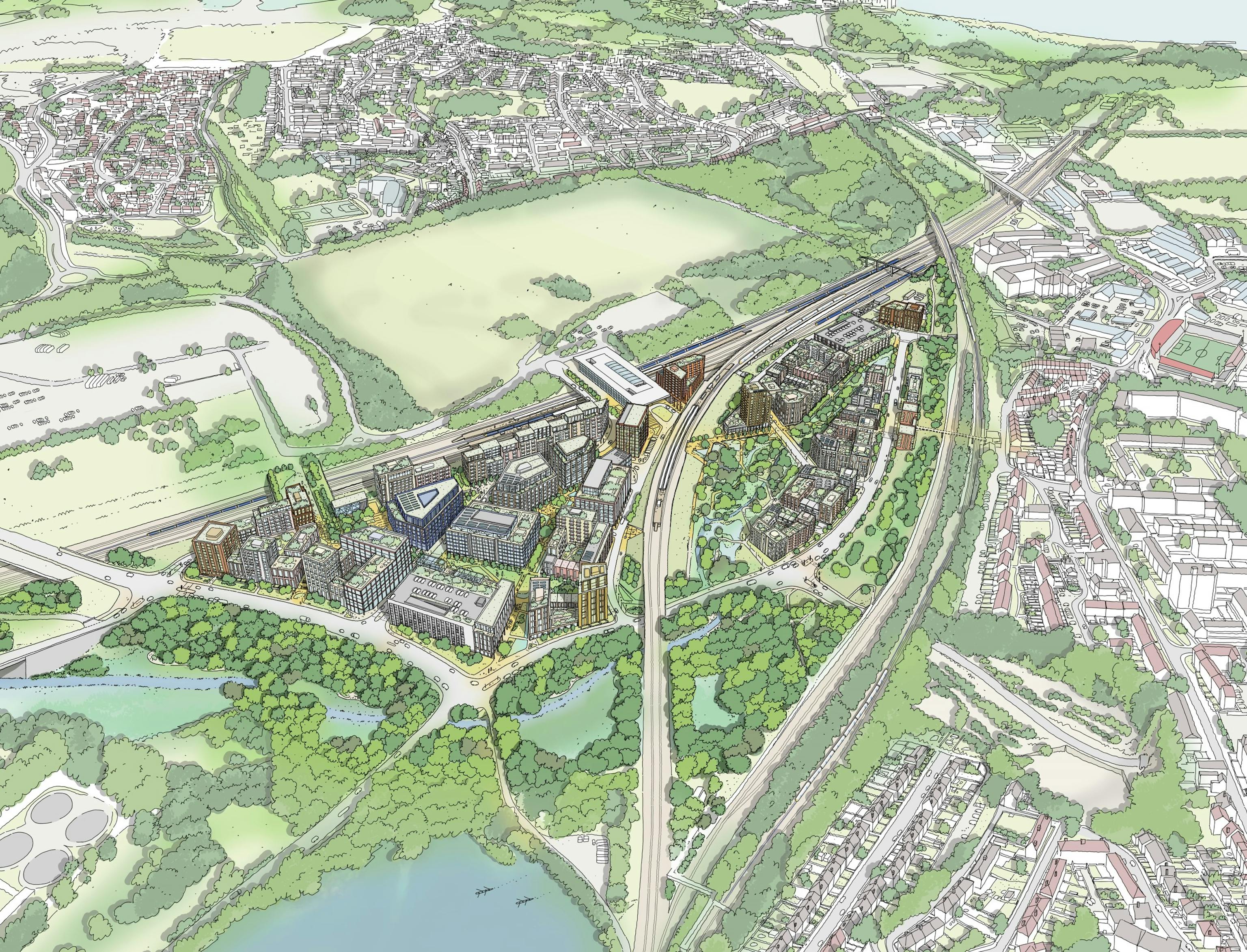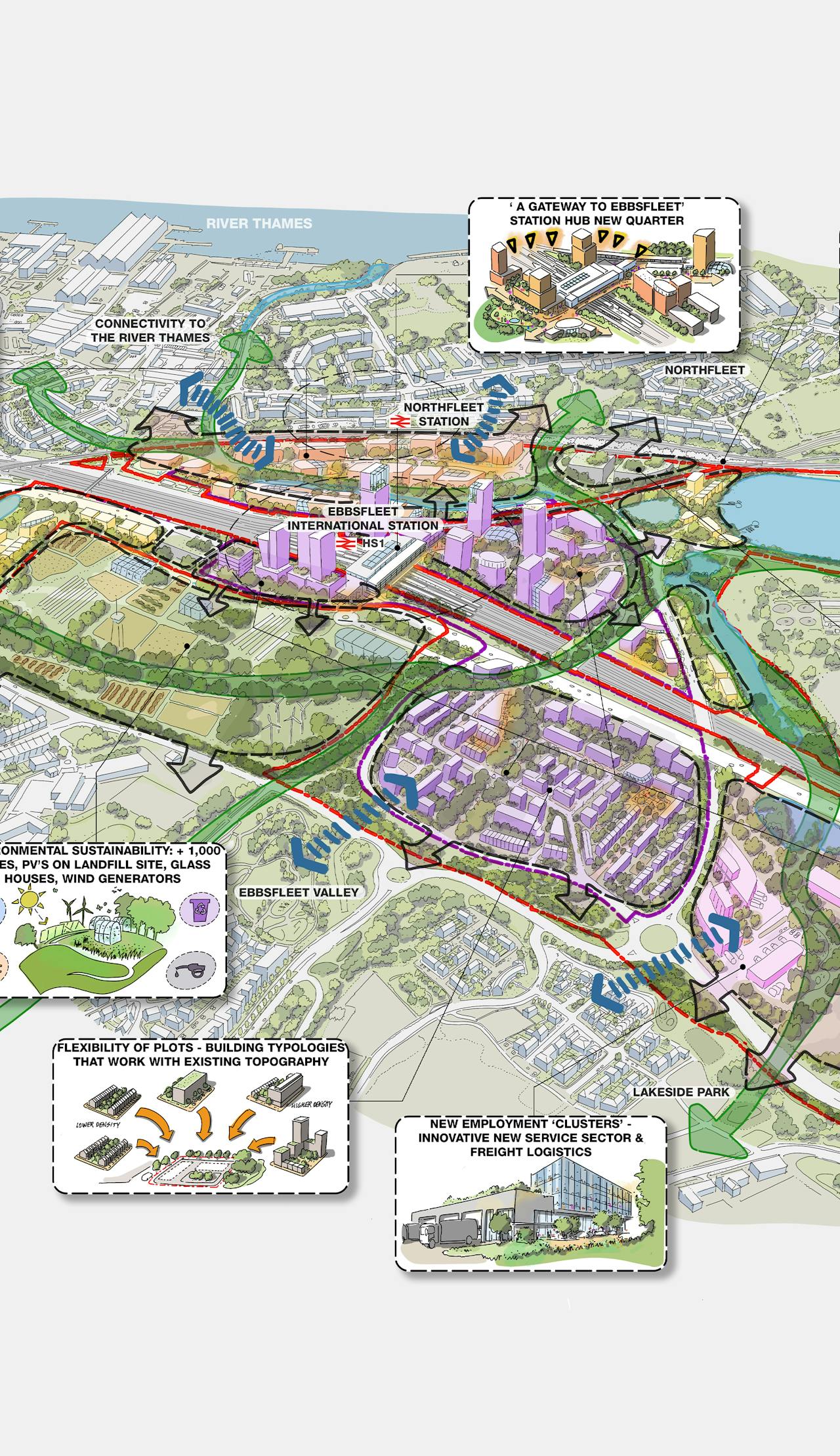 Organised into three areas - Northfleet Rise, the Station Garden and the City Park - the masterplan delivers a long-term vision for the Garden City. The new urban centre is linked to the surrounding communities, delivering a variety of homes, employment opportunities and commercially focused activity with an emphasis on health and well-being, high-quality open space, and sustainable modes of transport.