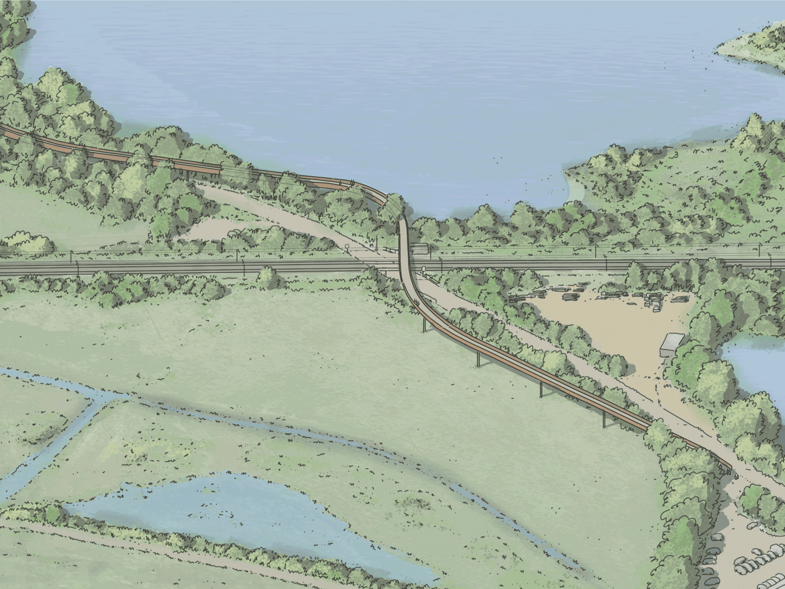 At Water Orton a pair of single-track viaducts carry HS2 over existing road and rail infrastructure, as well as over the HS2 mainline below. Complementary landscape proposals provide a positive lasting legacy for HS2. A subterranean river and new green public spaces, including a community orchard, create a unique public amenity for the local community.