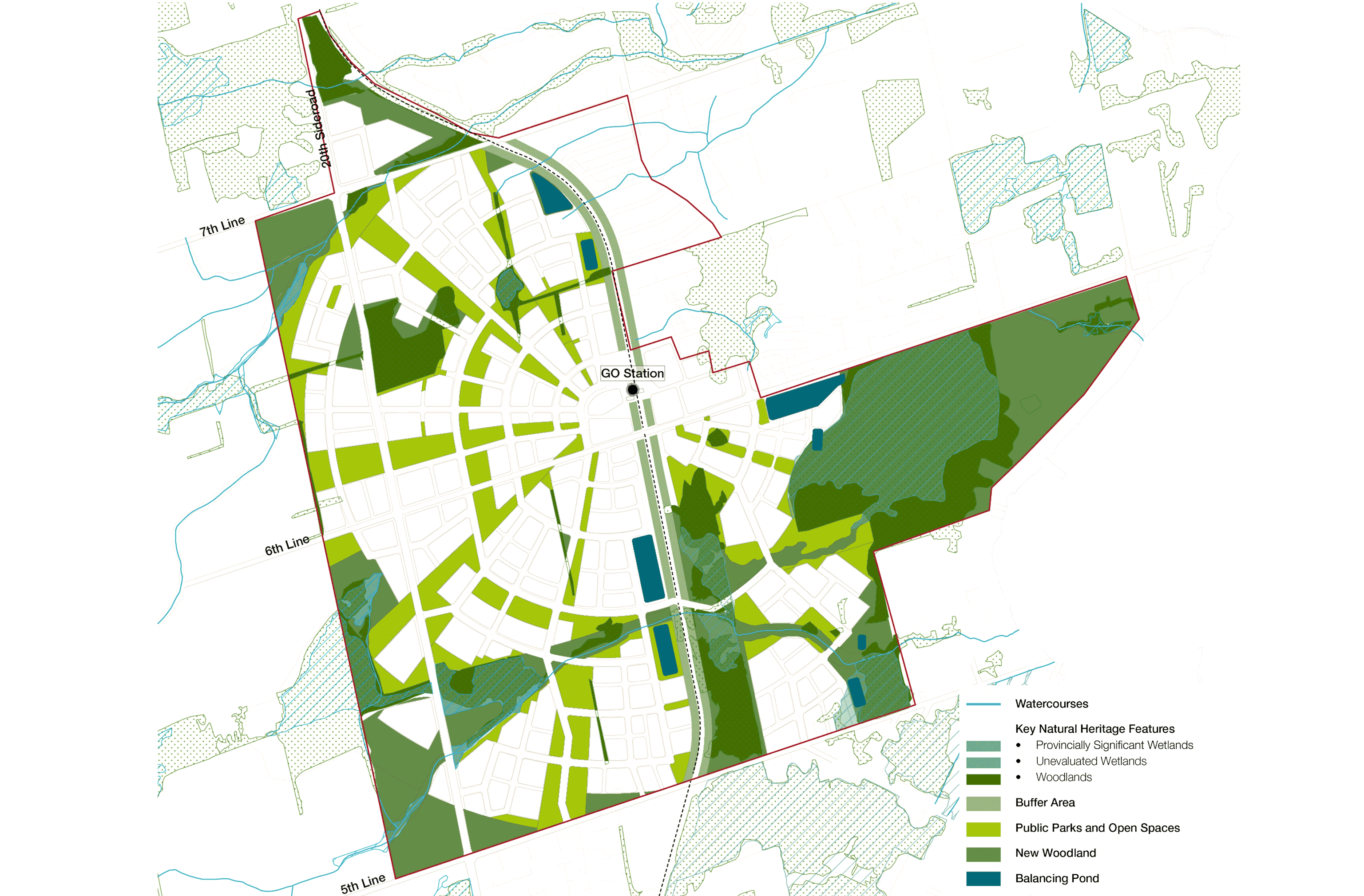 The Innisfil Orbit masterplan was centered around rigorous community engagement, close collaboration with landowners and local government, and a design process where people were at the centre of every decision. We specified core principles from the start that prioritised environmental responsibility, energy type and consumption, high quality built-form, flexibility in design and zoning, transportation and movement, and social and cultural viability.