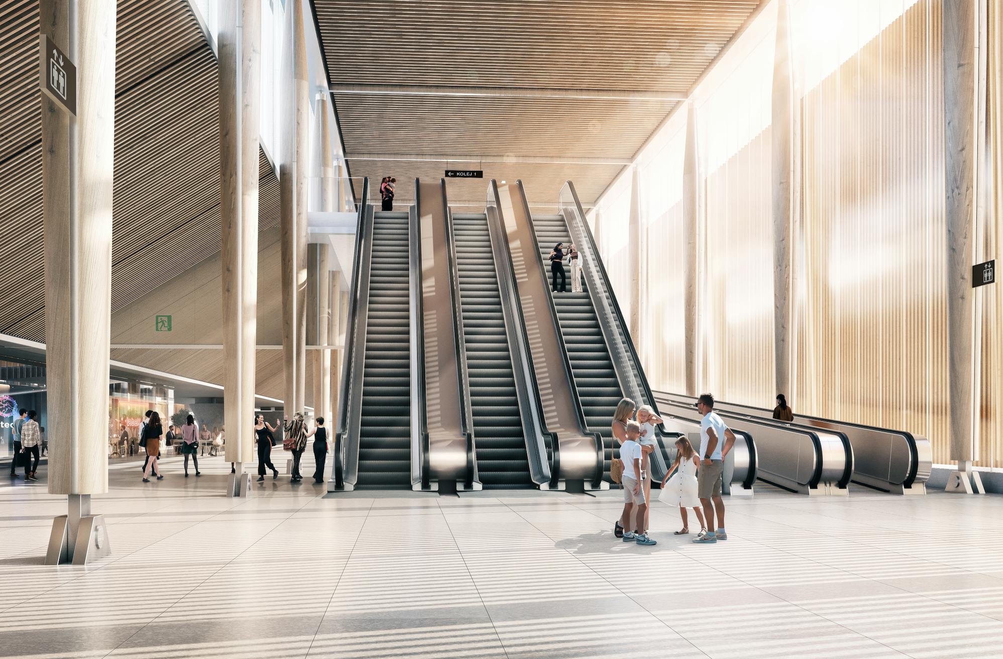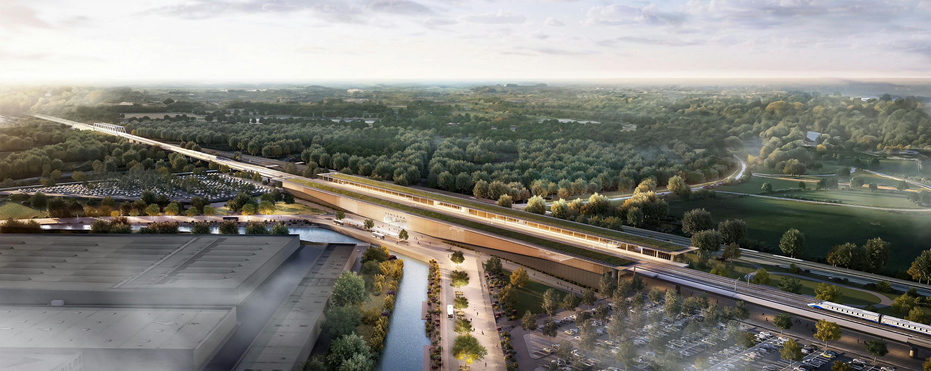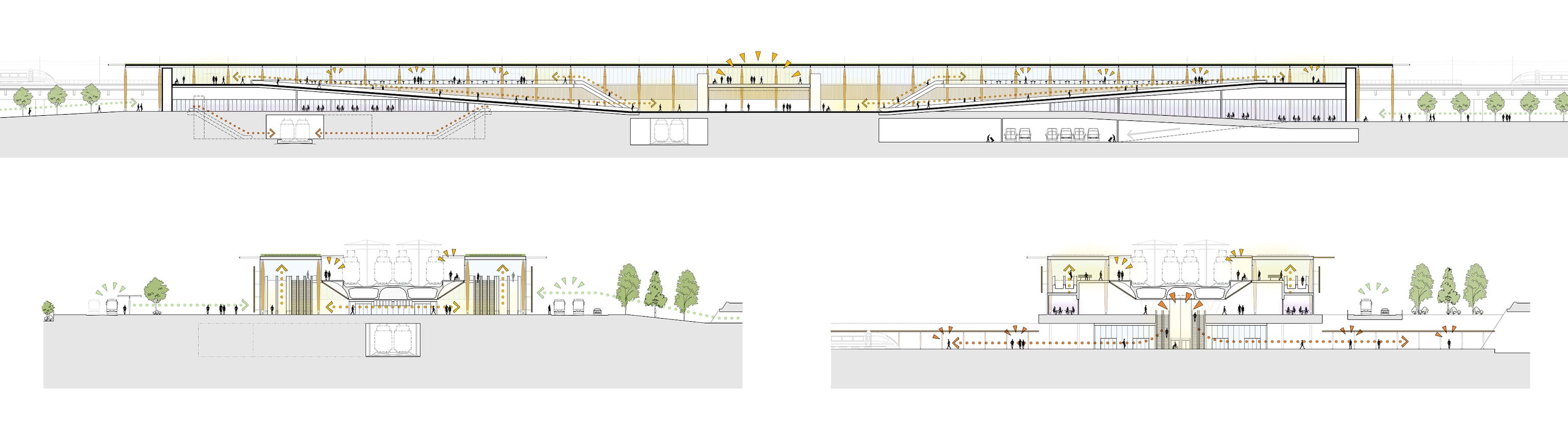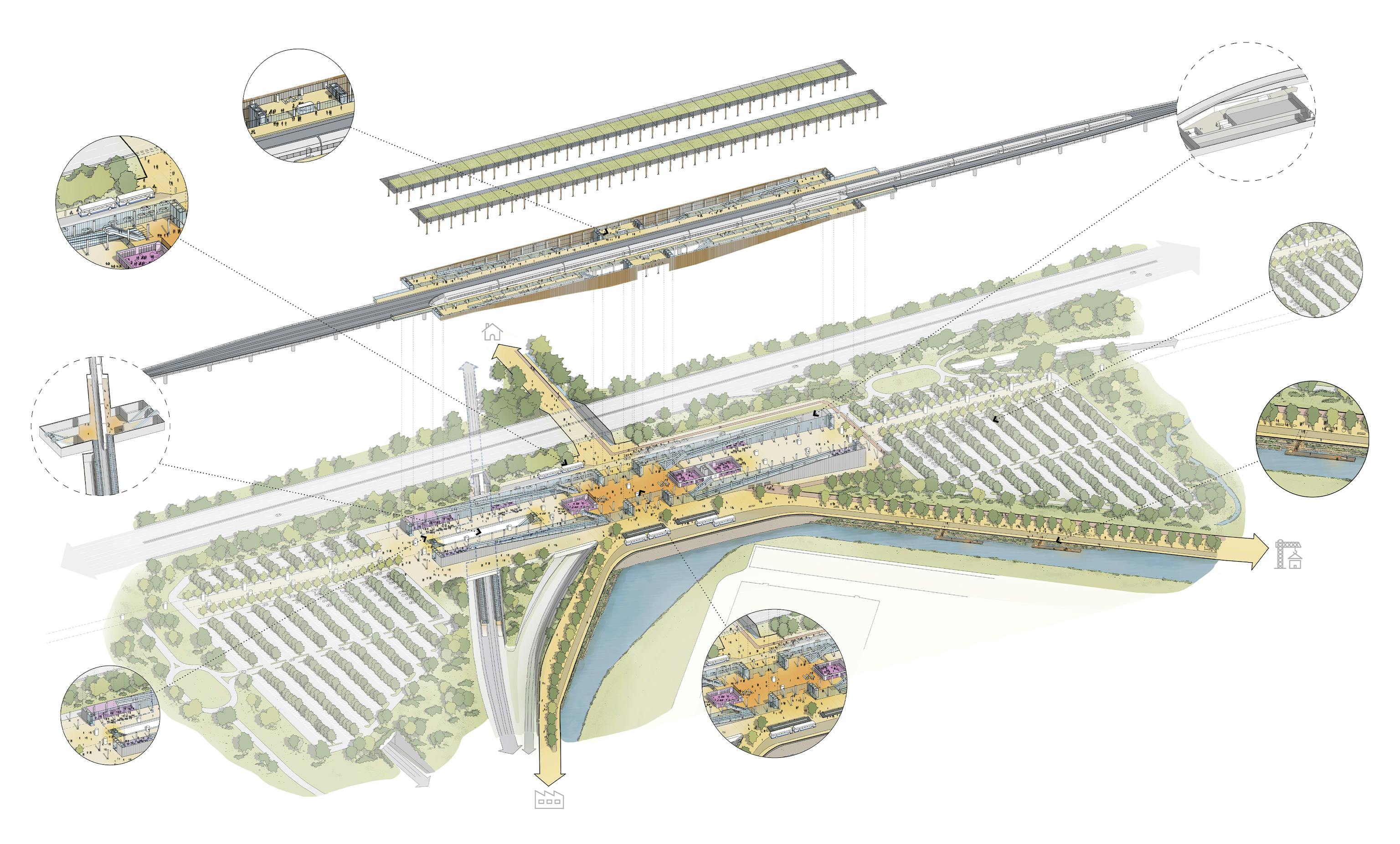 The station provides sustainable transport links to the local communities serving the high-speed rail network. Connections to the station include biodiverse nature walks, tree lined boulevards, and links to the local cycle network. New and/or replaced trees fill the hardscaped site within its wooded context, while timber cladding and a green roof further integrate it into nature.