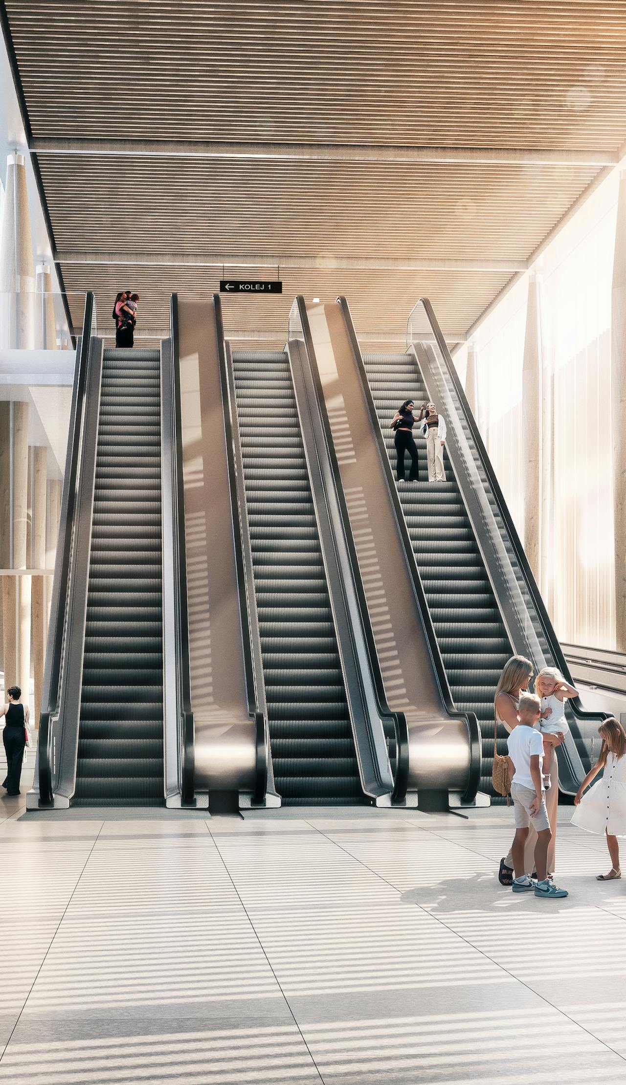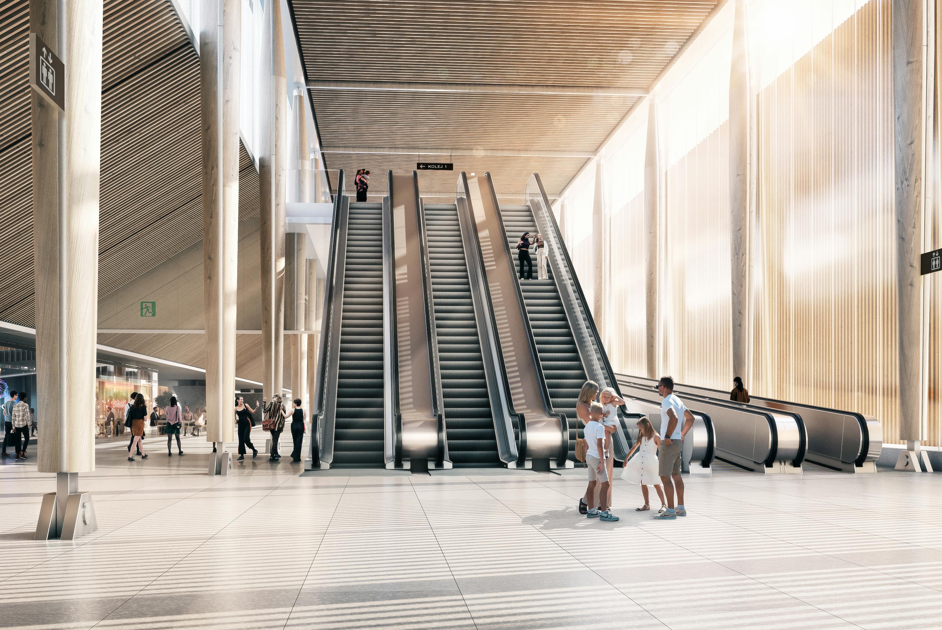 The station building form softens the interface between the rail viaduct and the surrounding rural context, with the station descending to meet a raised datum. The materiality of the design is primarily birch timber to reflect the wooded landscape. The station structure is designed to be independent of the viaduct structure allowing for a simple buildability, reducing the construction programme.